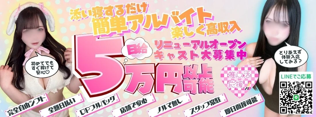 勤務してお給料がないなんてございません!当店の給料は偽りなく記載のとおりとなっておりますお給料は業界最高峰で高待遇!備品完備!はもちろん引かれもの一切ナシ!更に入店祝い金プレゼント(最大3万円)派閥や上下関係なく働けます!面接交通費支給(1000円~2000円)お給料全額日払い!ビラ配りなし!保障給料有ビラ配りされる方は別途給料有もちろんノルマ、雑費、遅刻や当欠の罰金もございません!◇◇◇◇◇◇◇◇◇◇◇◇◇◇◇◇◇◇【基本的な1日の給与体制】(時給1000✖労働時間)+接客手当(コース時間により変動)+コスプレ衣装代(最大13000円)+他手当・お給料全額日払い!お客さんがつかなかったからお給料がないなんてありえません!◇◇◇◇◇◇◇◇◇◇◇◇◇◇◇◇◇◇【衣装など必要な物】全てお店でご用意いたします◇◇◇◇◇◇◇◇◇◇◇◇◇◇◇◇◇◇【手当、お礼金】お友達紹介お礼金(最大3万円)支給◇◇◇◇◇◇◇◇◇◇◇◇◇◇◇◇◇◇【待機場、更衣室】待機場には飲み物やおやつも充実!アイロンやコテなどはもちろんございます。更衣室には個人ロッカーやシューズボックスなど設備も充実(^^♪◇◇◇◇◇◇◇◇◇◇◇◇◇◇◇◇◇◇